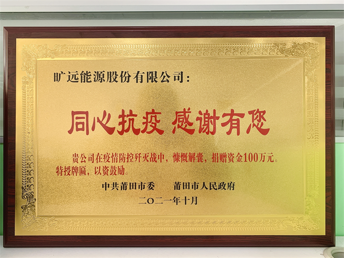 曠遠能源榮獲中共莆田市委、莆田市人民政府授予【同心抗疫 感謝有您】獎牌證書